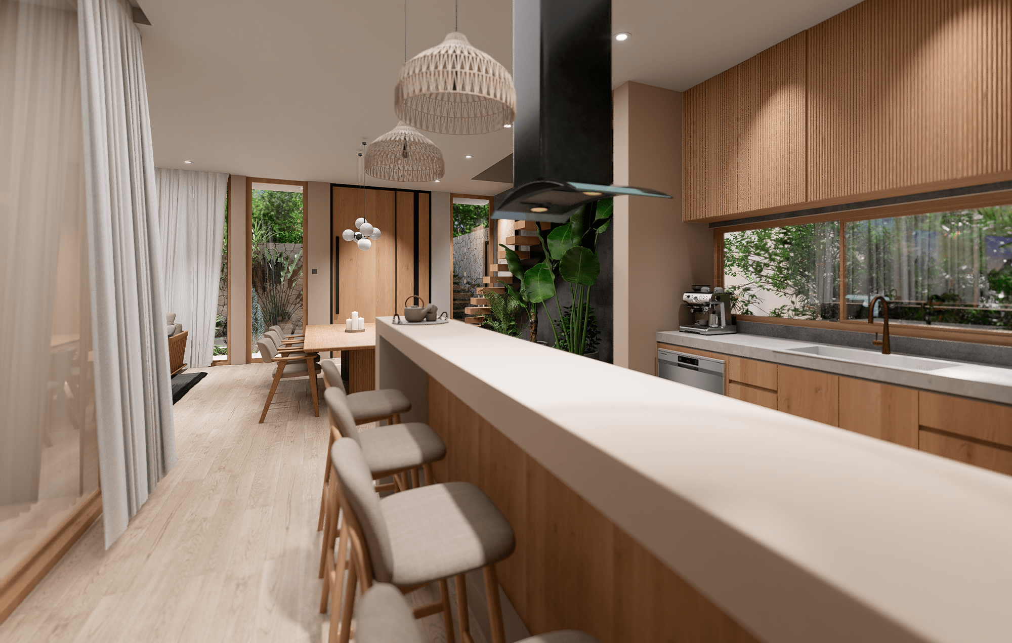 Un espacio moderno para cocinar y crear. Equipado con electrodomésticos y una isla central para facilitar la preparación de comidas y con acceso directo al área de asador exterior.